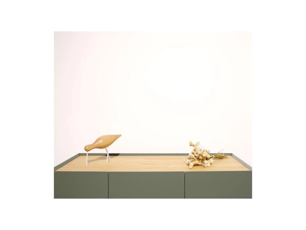Le corps revêtu d’une laque verte à la profondeur de teinte surprenante met parfaitement en contraste le plateau, vous pourrez ainsi intégrer ce meuble à un salon moderne mais aussi à du mobilier plus classique.