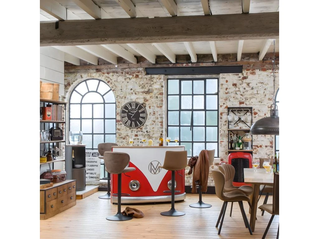 Véritable accessoire de décoration vintage, son principal atout est sans aucun doute son originalité. Plus qu’un bar industriel, c’est un accessoire de décoration qui fera le bonheur des amateurs d’originalité ! Réalisé en métal rouge et blanc, il est doté d’un plateau en bois de manguier qui apporte un très bel équilibre entre les nuances. Il est loin d’être banal grâce à son design et ses phares apparents. Ce bar qui allie esthétisme et fonctionnalité vous proposera différents plateaux en manguier qui vous permettront de stocker et d’organiser votre rangement. Chaque modèle est unique. Ce bar est livré monté.