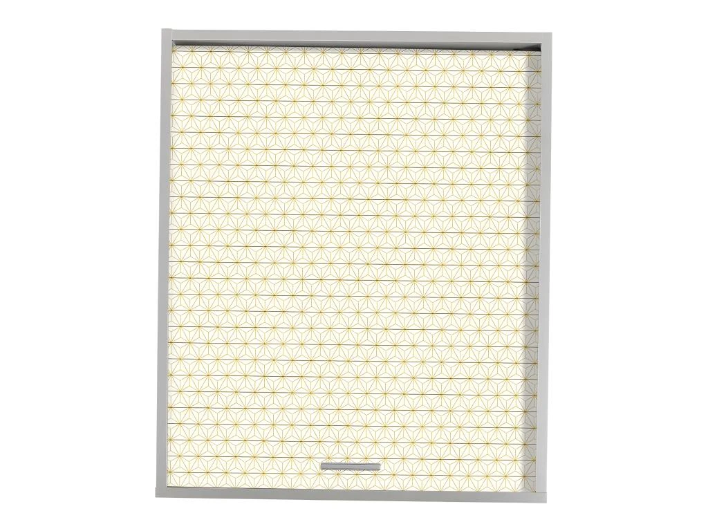Meuble Elément haut de Cuisine coloris Alu à poser sur le plan de travail ou à suspendre à mur. Rideau imprimé