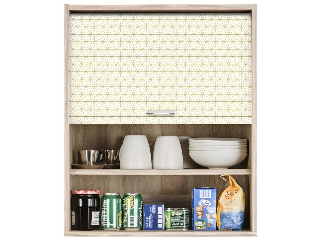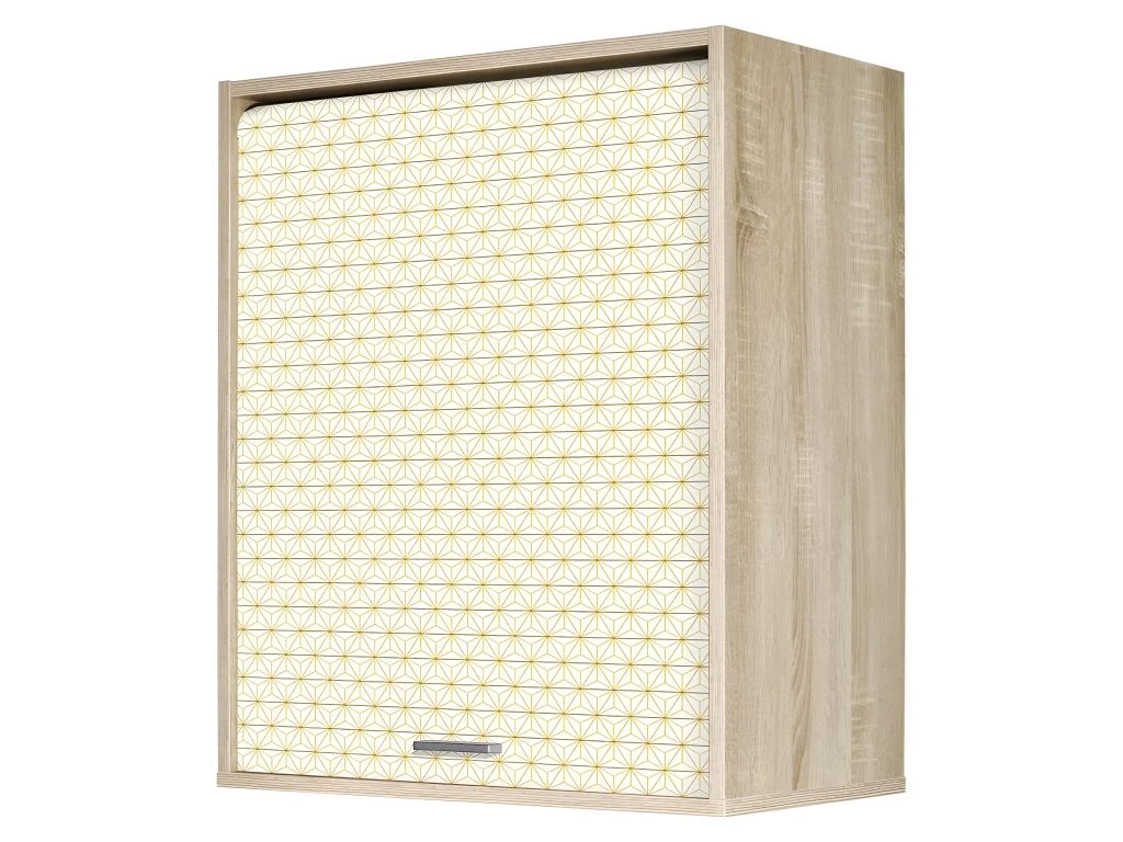 Meuble Elément haut de Cuisine coloris Chêne à poser sur le plan de travail ou à suspendre à mur. Rideau imprimé