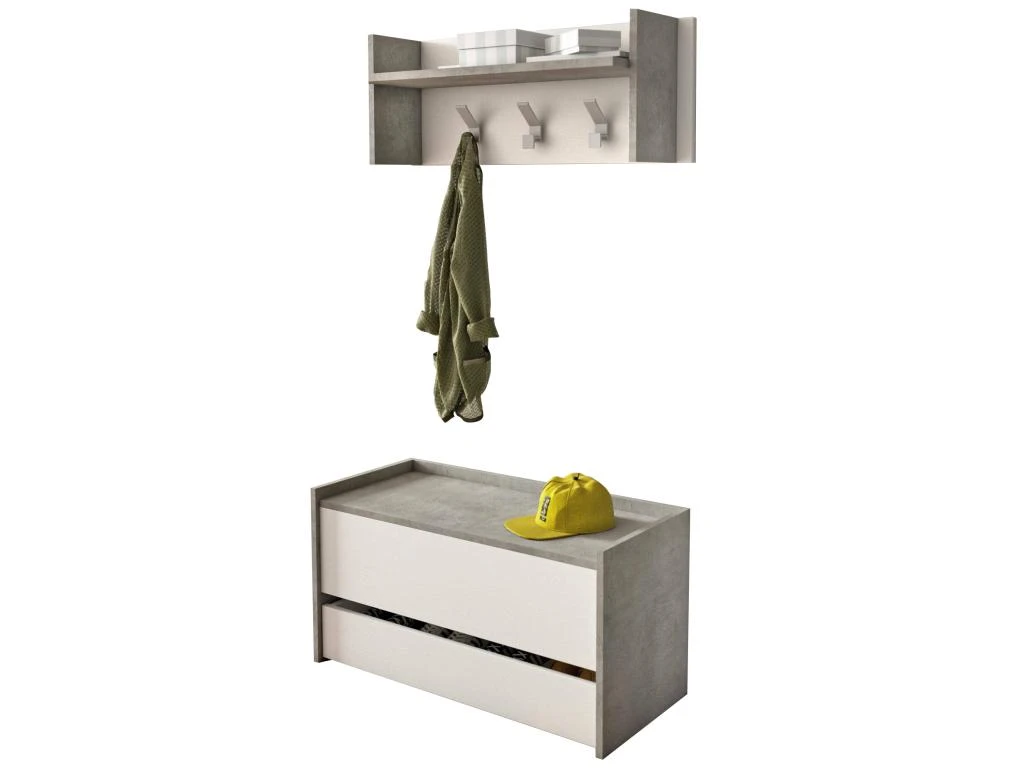 STRUCTURE ET UTILISATION – Ensemble d’entrée moderne composé d’une malle de rangement polyvalente et d’un meuble avec trois patères et une étagère supérieure, c’est la solution idéale pour meubler avec élégance votre entrée – Grâce à la composition complète de tout ce dont vous avez besoin, il est parfait pour votre entrée – Le porte-manteau comprend 3 crochets idéaux pour suspendre des vestes et des manteaux et une étagère supérieure pour ranger des chapeaux ou des sacs – La boîte de rangement pratique est idéale pour organiser soigneusement vos affaires, parfaite pour être utilisée comme chaise lorsque le couvercle est fermé – Le tiroir inclus peut être facilement utilisé comme étagère à chaussures pratique.