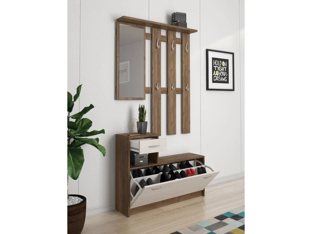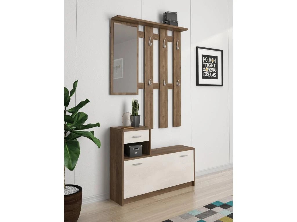 STRUCTURE ET UTILISATION – Meuble d’entrée moderne avec porte-chaussures et patères, c’est la solution idéale pour meubler élégamment et intelligemment votre entrée – Les éléments qui le composent le rendent parfait pour le hall d’entrée, grâce à la composition complète de tout le nécessaire pour la votre entrée – En partie haute on trouve 4 patères idéales pour suspendre vestes et manteaux, en partie basse on trouve un meuble à chaussures pouvant accueillir jusqu’à 12 paires de chaussures – L’étagère et le tiroir complétant la structure vous permettront pour laisser vos petits objets de manière ordonnée et toujours à portée de main.