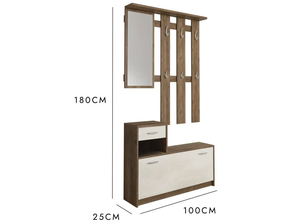 DIMENSIONS EN CM – Meuble d’entrée: Longueur: 100 Largeur: 25 Hauteur: 180 – Tiroir: 31,5x15h15 – Range chaussures 100x15h45 – Miroir 30h75