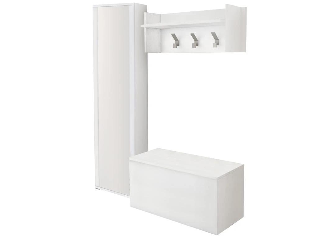 DIMENSIONS EN CM – Patère : Longueur : 90 Largeur : 29 Hauteur : 34 – Coffre : 90x45h45 – Range-chaussures 50x32h182