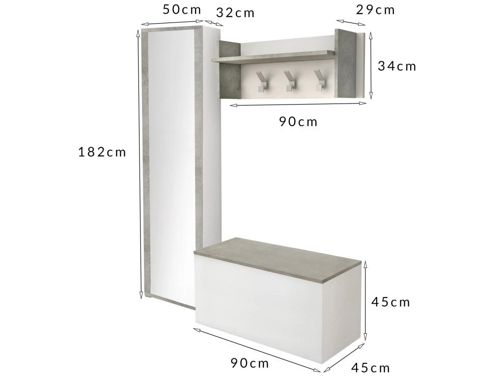 DIMENSIONS EN CM – Patère : Longueur : 90 Largeur : 29 Hauteur : 34 – Coffre : 90x45h45 – Range-chaussures 50x32h182