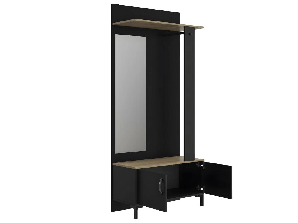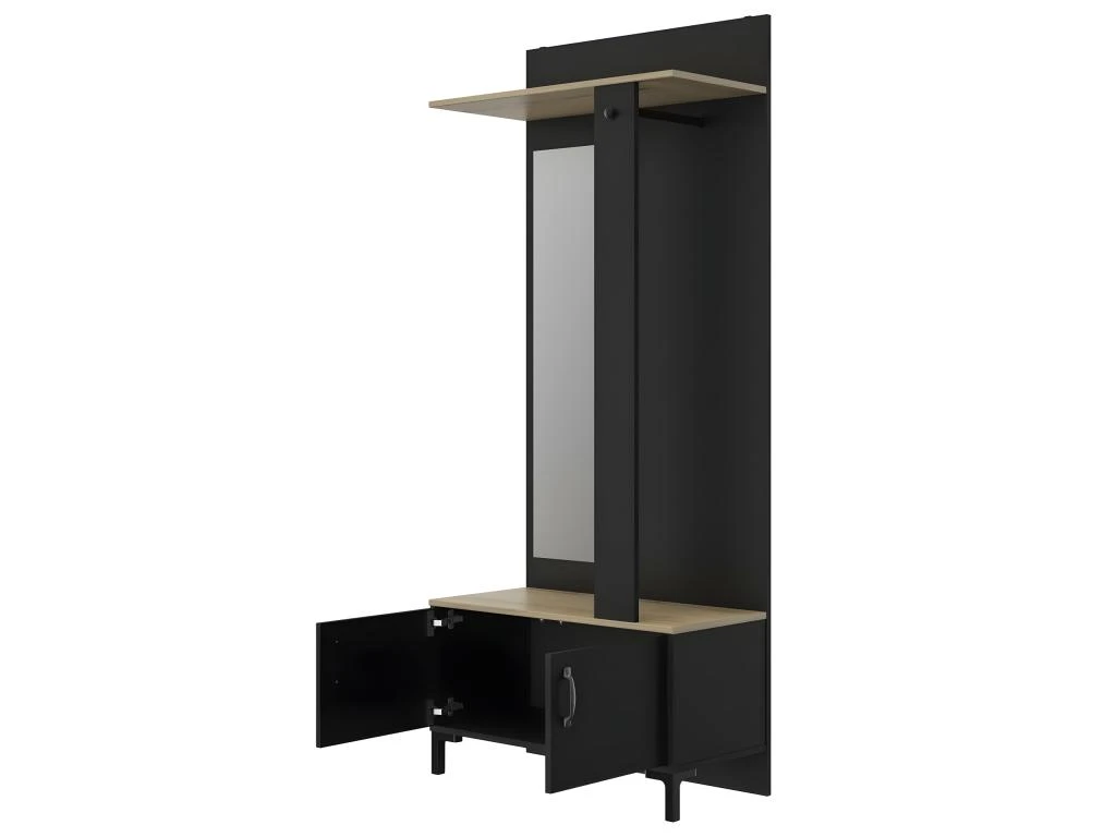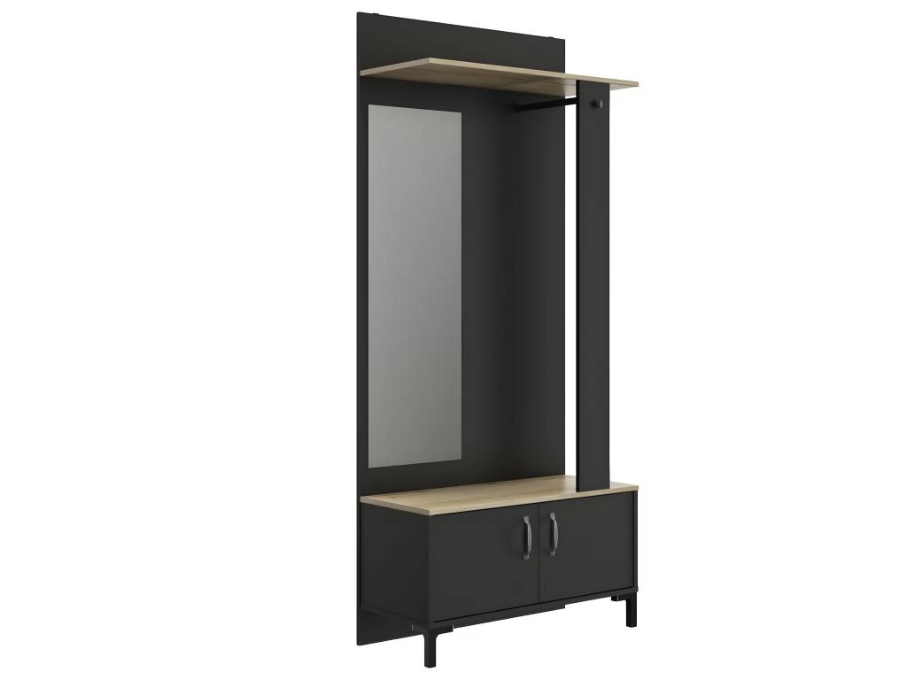 Conçue en panneaux de particules revêtus papier imitation chêne, ce meuble d’entrée dispose d’une tringle pour porte-manteaux en partie haute, d’un bouton patère et d’un miroir verre clair argenté.