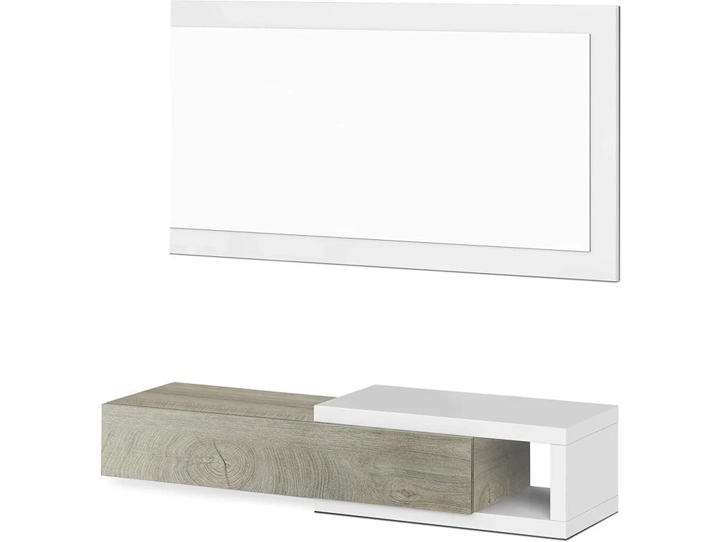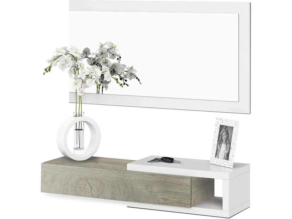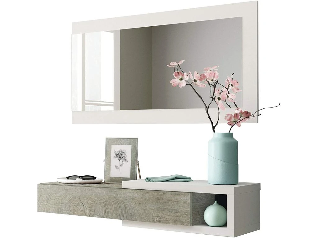 – La pièce supérieure se compose d’un miroir rectangulaire avec un cadre blanc, le module inférieur se compose d’un tiroir et d’une petite surface latérale utile, idéale pour y placer un objet décoratif.
