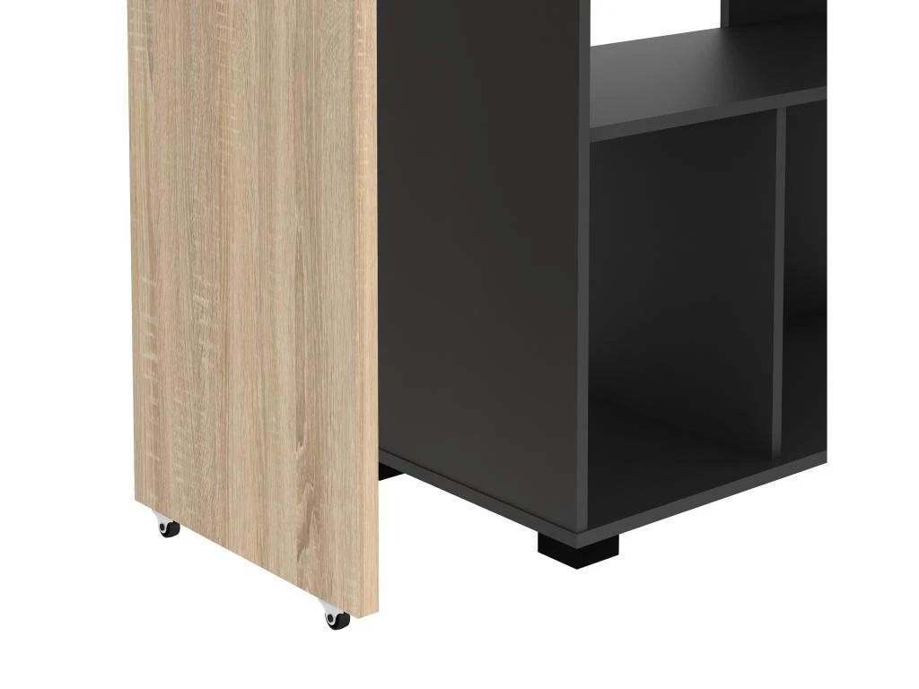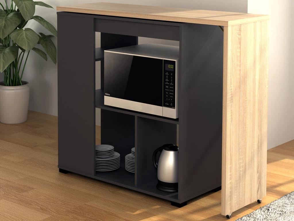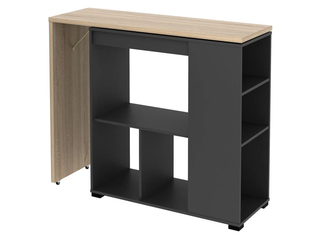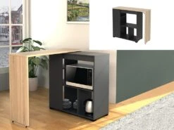 Design et fonctionnel ce meuble de bar dispose d’un plateau pivotant modulable à souhait qui vous permettra d’accueillir un plus grand nombre de convives quand vous le voudrez. Grâce à ses six niches de rangement, vous pourrez facilement y encastrer votre micro-ondes et ranger votre vaisselle.