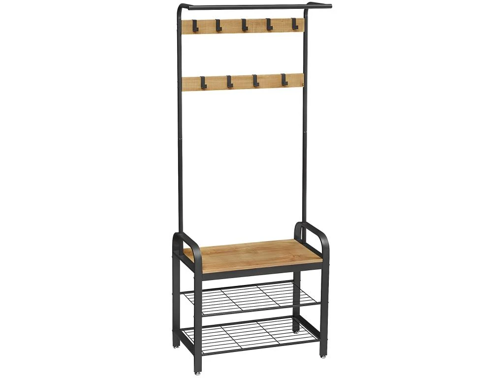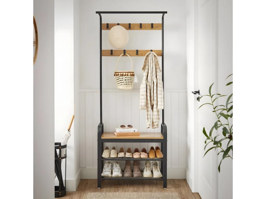 Le porte-manteaux avec une assise et 2 tablettes à chaussures apportera de l’ordre dans le hall d’entrée. Il comporte au total 9 crochets dans 2 rangées et une tringle à vêtements. La structure en acier garantit la stabilité du meuble. Les pieds réglables permettent de mettre le meuble à niveau. La charge maximale de l’assise est de 80 kg. La distance entre les tablettes à chaussures est de 18 cm. 7 cm et 17.5 cm, POINTS FORTS: Style moderne, 2x étagère, 1x assise, Finition : base en coloris noir, assise et panneau en coloris brun miel, Meuble pratique et spacieux, Fait en matériaux de haute qualité, CARACTÉRISTIQUES TECHNIQUES: Largeur 72 cm, Profondeur 33.7 cm, Hauteur 183 cm, Matériau : panneau de particules, acier, À monter soi-même, Photos des articles les plus fidèles possible, mais restant non contractuelles, les nuances de couleur et le rendu des matières présentés à l’écran pouvant être différents de la réalité, Veuillez sécuriser le meuble contre le basculement avec l’accesoire de montage fourni