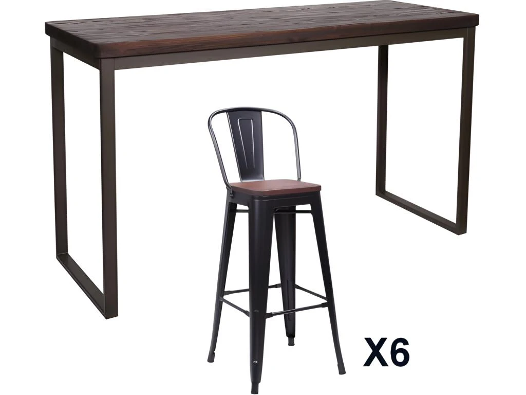 Ensemble de repas qui comprend un mange debout de 180 cm et 6 chaises de bar avec dossiers assorties dans la collection Nevada.