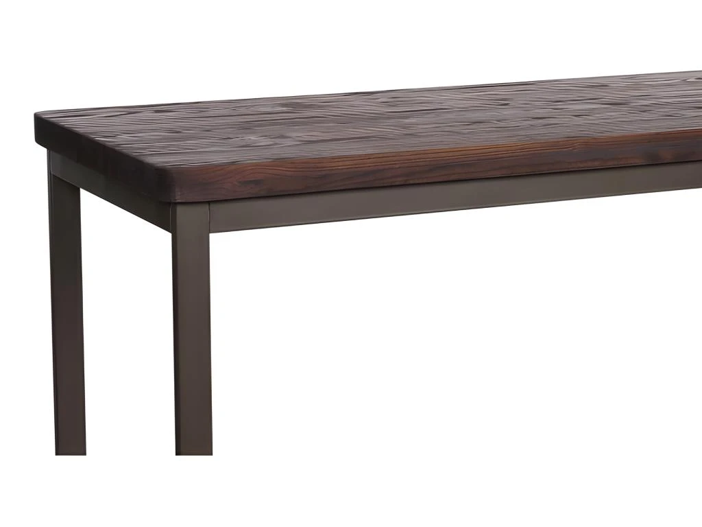 Plateau en Orme massif foncé, et piètement en acier gris.