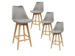Piètement en bois massif coloris naturel. Coque assise et dossier en polypropylène gris. Coussin assise en simili coloris gris. Hauteur d’assise : 70,5 cm.