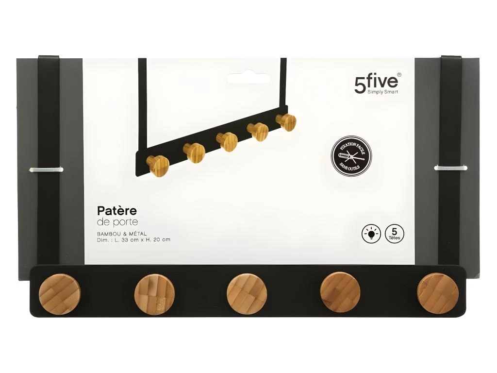 Patère de porte en Métal Noir 5 Têtes en Bambou L 33 cm – Dimensions : L. 33 x P. 5 x H. 20 cm – Matière : Métal et Bambou –