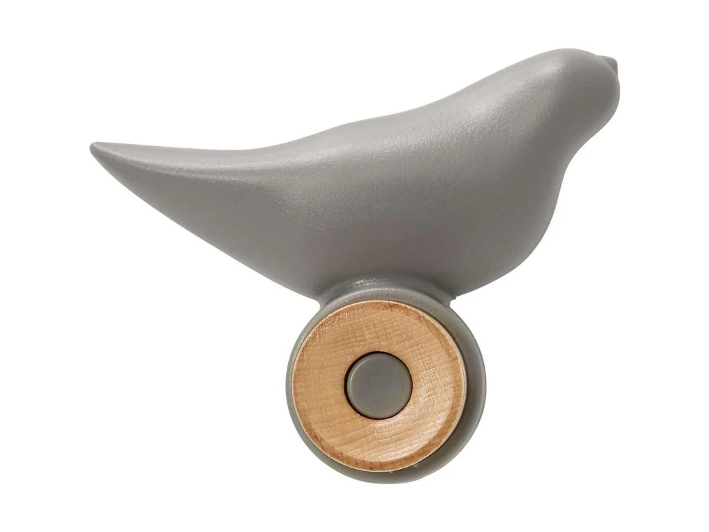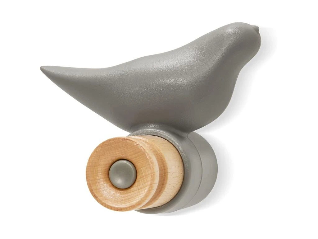 Matière : Polymère, Crochet en bois couleur naturelle & Déco oiseau en matière plastique grise.,