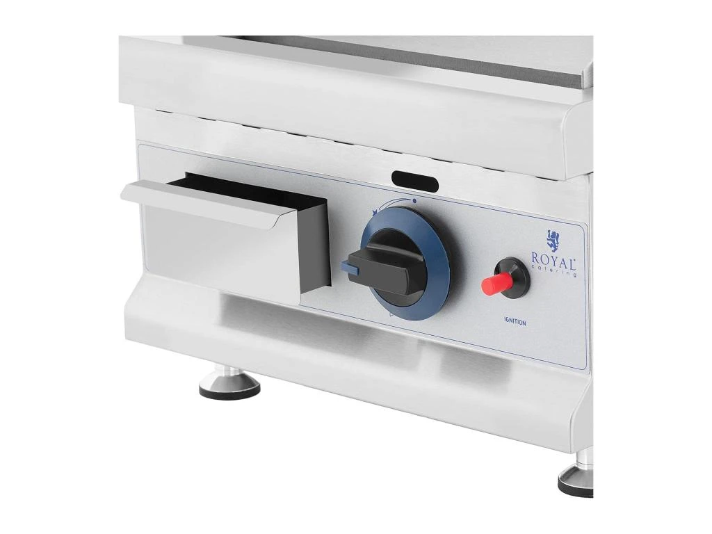 Ce grill à gaz professionnel comporte une gouttière qui dirige l’excédent de gras vers un tiroir collecteur amovible, ce qui favorise une cuisson saine et faible en matières grasses.