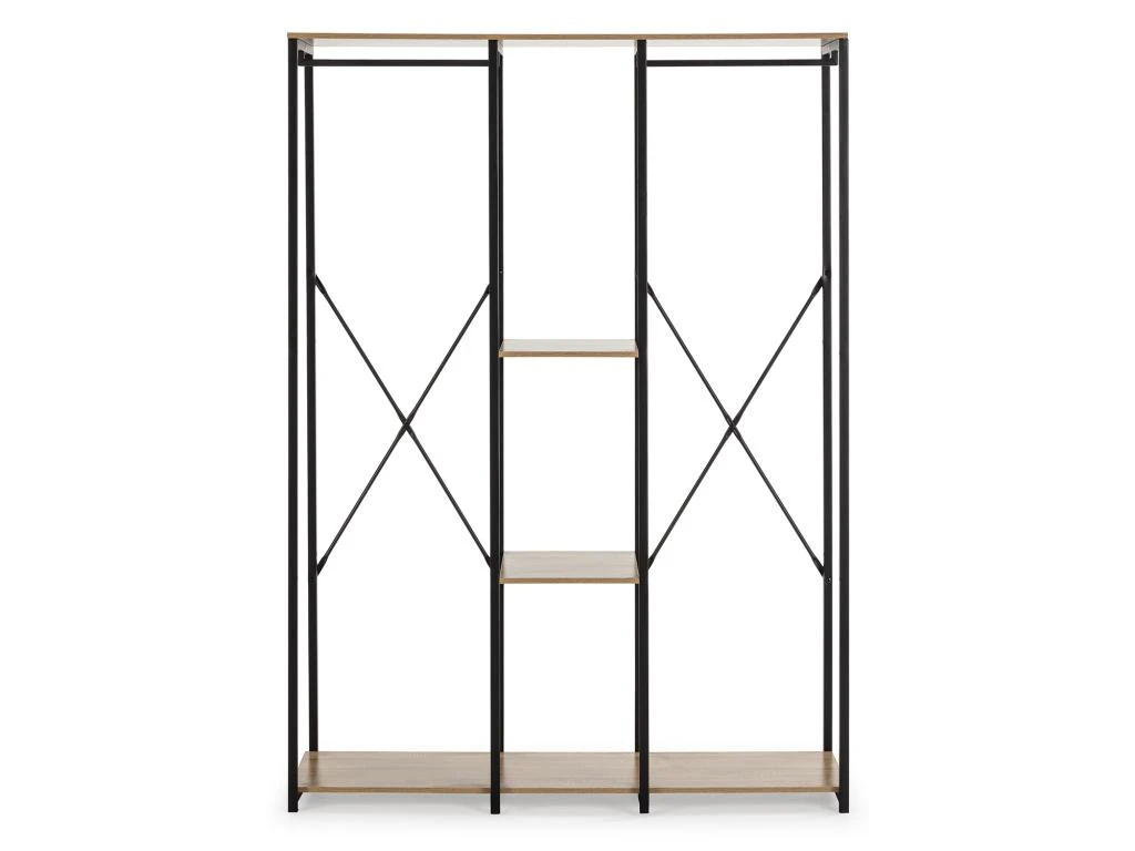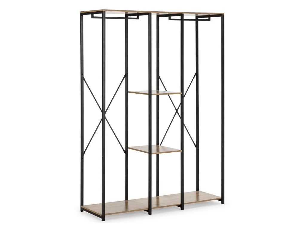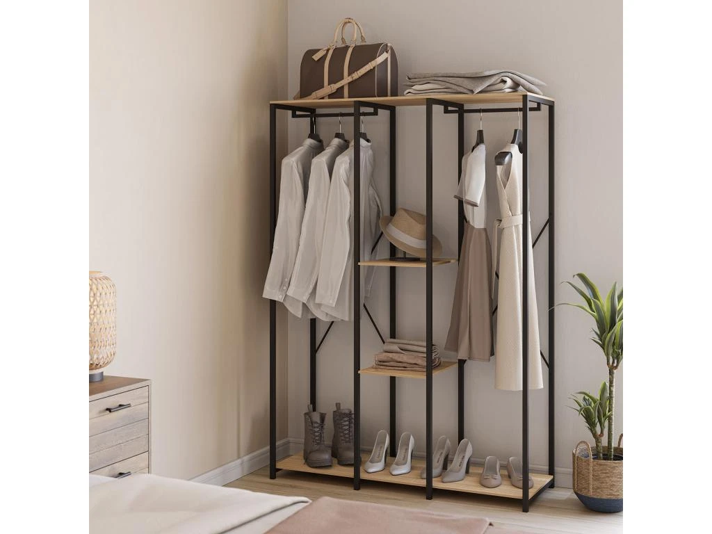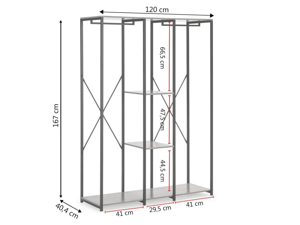 · Cette armoire avec portemanteau est en mélamine et contient 3 étagères et 2 barres pour accrocher les cintres avec les vêtements. Son cadre en tube noir est en acier et cette structure offre résistance et durabilité.