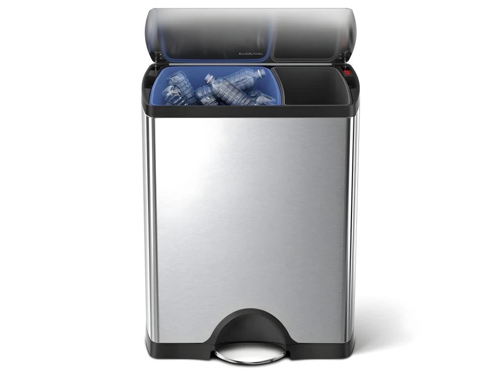 Idéale pour les cuisines animées, la poubelle de recyclage à double compartiment simplehuman contient les déchets et les objets recyclables dans un seul conteneur.