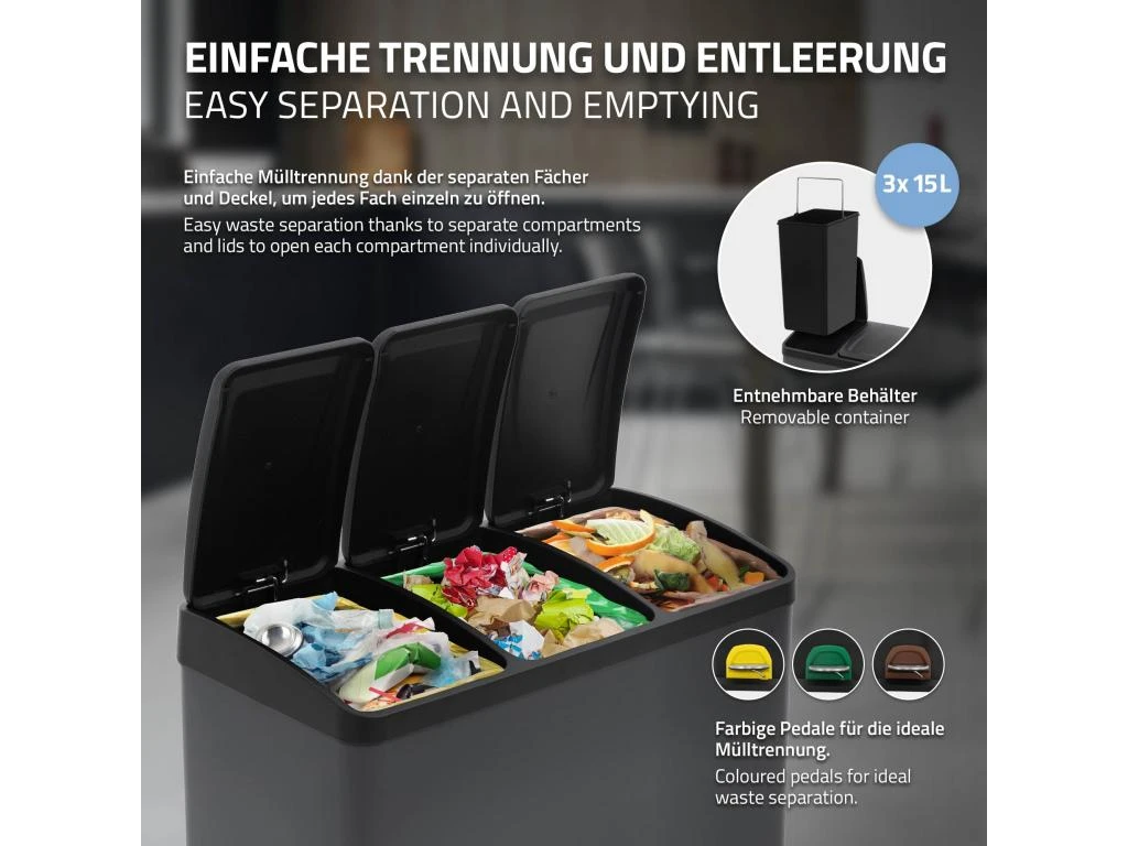 Cette poubelle 3 en 1 est parfaite pour le tri des déchets. Trois compartiments séparés les uns des autres vous offrent suffisamment de place pour jeter vos déchets.