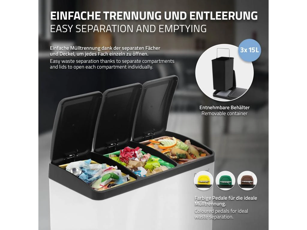 Cette poubelle 3 en 1 est parfaite pour le tri des déchets. Trois compartiments séparés les uns des autres vous offrent suffisamment de place pour jeter vos déchets.