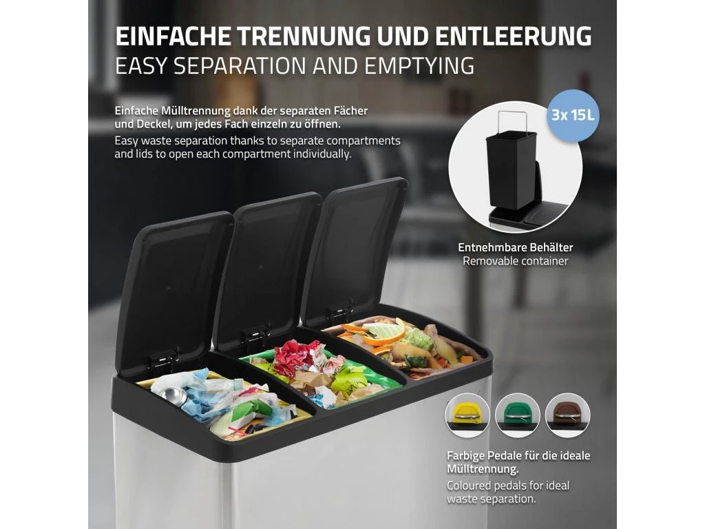 Cette poubelle 3 en 1 est parfaite pour le tri des déchets. Trois compartiments séparés les uns des autres vous offrent suffisamment de place pour jeter vos déchets.