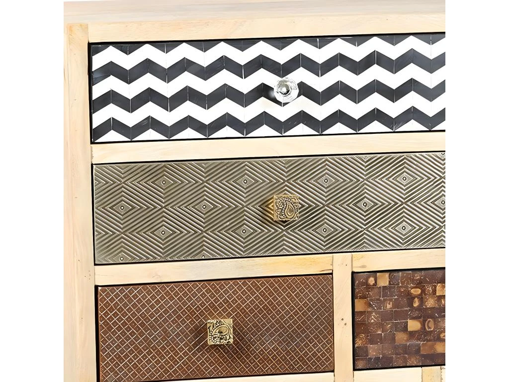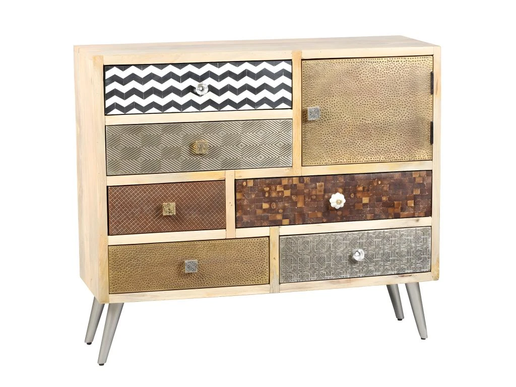 Un meuble haut en couleurs proposant des rangements de toute taille pour votre intérieur. Envie d’originalité dans votre intérieur ? Soyez sûr de faire mouche avec la gamme Razon riche en couleurs et en motifs. Structure et tiroirs en palissandre, finition vernis nitro-cellulosique. Façade porte et tiroir en acier structuré décoratif. Pieds démontés.