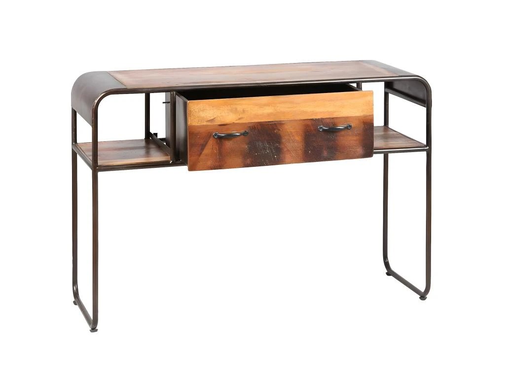 Une gamme de meuble impactante grâce à l’alliance du métal et du bois de récupération. Pouvant être utilisé aussi bien comme console que comme bureau, ce meuble au look atypique est équipé d’un grand tiroir de rangement.