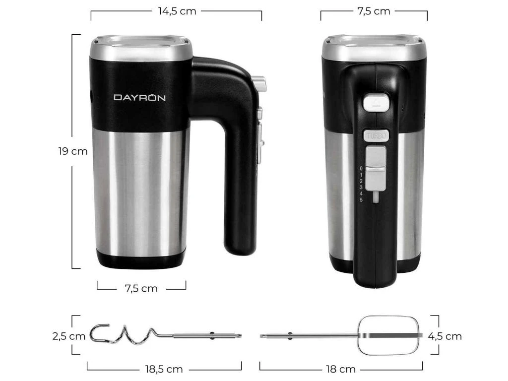 Le mixeur plongeant rétro 500W de Dayron donne une touche vintage à votre cuisine. Grâce à sa puissance élevée, vous pourrez obtenir une qualité parfaite dans les textures. Particulièrement adapté à la pâtisserie. Créez des pâtes moelleuses ou battez de délicieuses garnitures. Surprenez votre famille et vos amis avec des gâteaux et des tartes à s’en lécher les doigts. Ce batteur est fabriqué en acier inoxydable. Il est solide et durable pour une utilisation quotidienne. Ses lames tournent puissamment, facilitant ainsi la circulation et le mélange parfait des aliments. Il possède 2 batteurs et 2 crochets pétrisseurs. Équipé de 5 niveaux de puissance pour vous permettre de choisir celui dont vous avez besoin à tout moment. Fonction turbo pour une vitesse encore plus élevée. Fouette et pétrit à une vitesse de 5000 tours par minute. Son design rétro et ergonomique sera parfait dans votre cuisine. Cordon avec système de rotation pour éviter les enchevêtrements. Produit sans BPA. Faites-vous plaisir et rapportez un mixeur à la maison pour surprendre votre famille et vos amis avec de délicieux desserts. *Veuillez noter que les images, les mesures et les couleurs de certains de nos produits sont données à titre indicatif. Les écrans peuvent parfois présenter de légères variations d’affichage dues au calibrage, à l’angle, à la lumière et à d’autres facteurs.