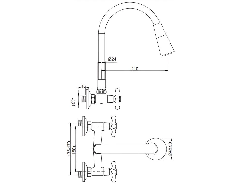 – Type: mitigeur mural cuisine/salle de bain avec bec flexible;