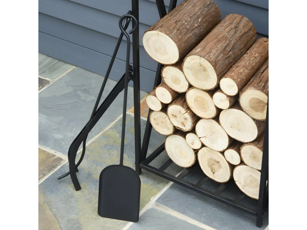 Le serviteur de cheminée range-bûches 2 en 1 est équipé d’une étagère et de 4 ustensiles : une pelle, un balai, un tisonnier et une pince. Chaque accessoire est muni d’un crochet d’attache afin de faciliter son rangement.