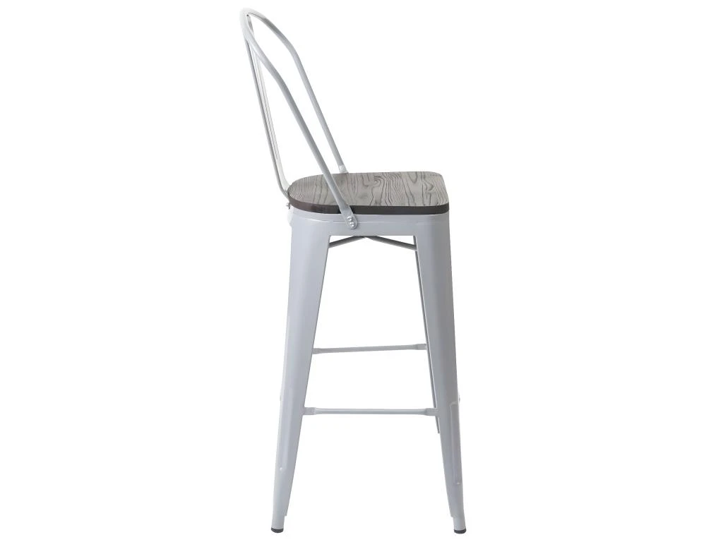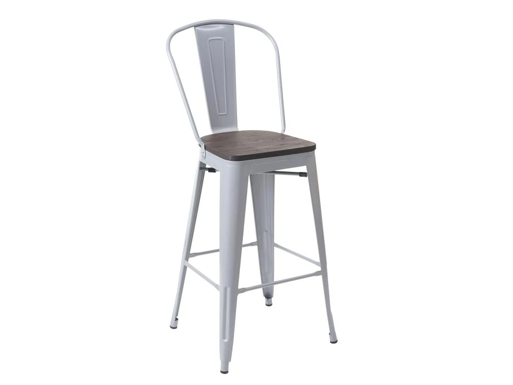 Tabouret de bar avec assise en bois et dossier, design industriel en métal gris