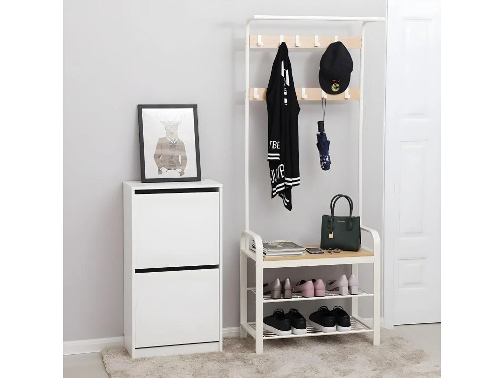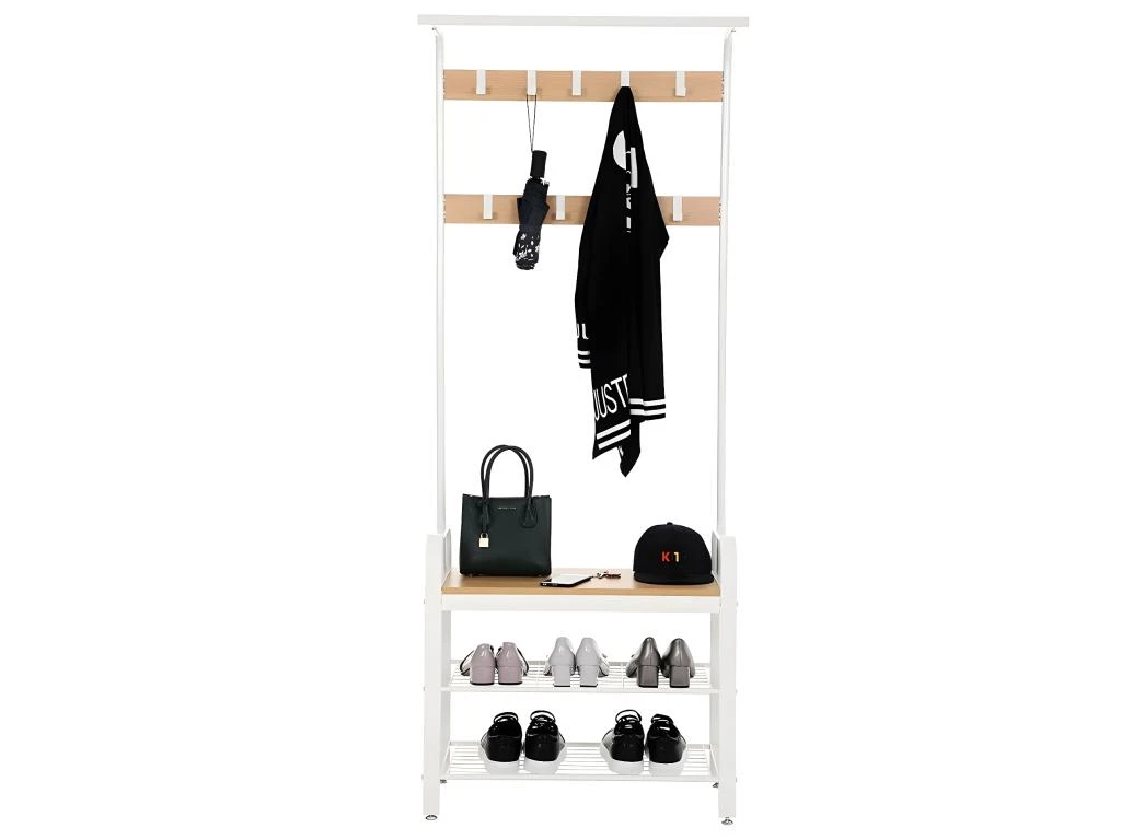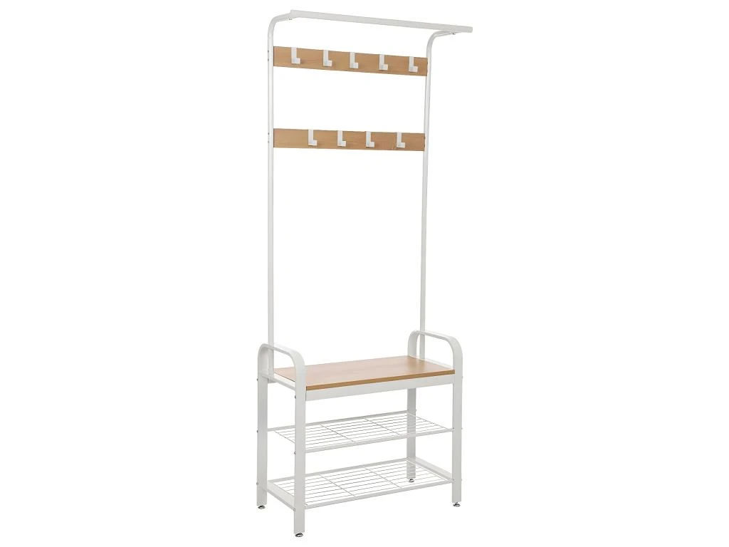 Un porte-vêtements avec une assise et des tablettes à chaussures est un meuble pratique pour le couloir. Il comporte 9 crochets disposés dans 2 rangées. En bas, vous disposez de 2 tablettes à chaussures spacieuses. La construction en fer et les éléments parfaitement ajustés des tablettes assurent la stabilité du meuble. Charge maximale par crochet 3 kg. La charge maximale de l’assise est de 80 kg. La distance entre les tablettes à chaussures est de 18.7 cm., POINTS FORTS: Style moderne, 2x tablette, 1x tringle, 9x crochet, Finition : cadre en coloris blanc, assise et panneaux en coloris bois naturel, Meuble pratique et élégant, Construction robuste, CARACTÉRISTIQUES TECHNIQUES: Largeur 72 cm, Profondeur 33.7 cm, Hauteur 183 cm, Matériau : panneau de particules, fer, À monter soi-même, Photos des articles les plus fidèles possible, mais restant non contractuelles, les nuances de couleur et le rendu des matières présentés à l’écran pouvant être différents de la réalité