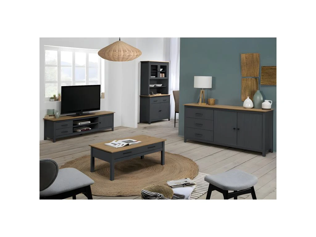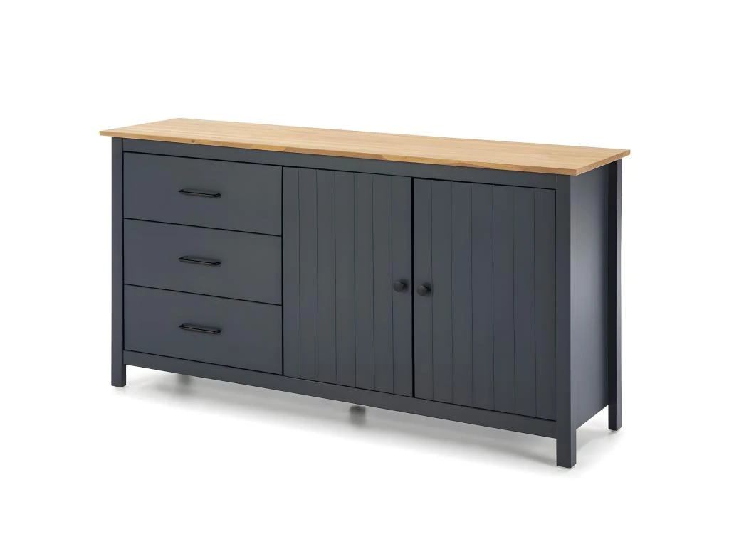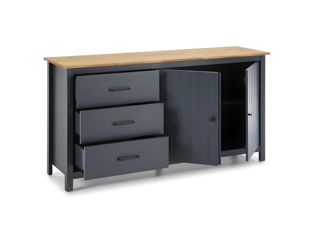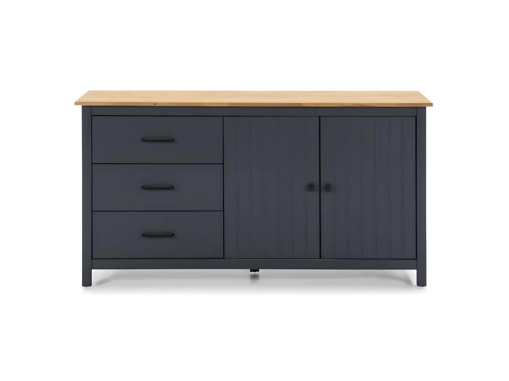 Buffet Bas 2 Portes 3 Tiroirs Bois Ciré coloris Bleu Pétrole de la gamme Tina.