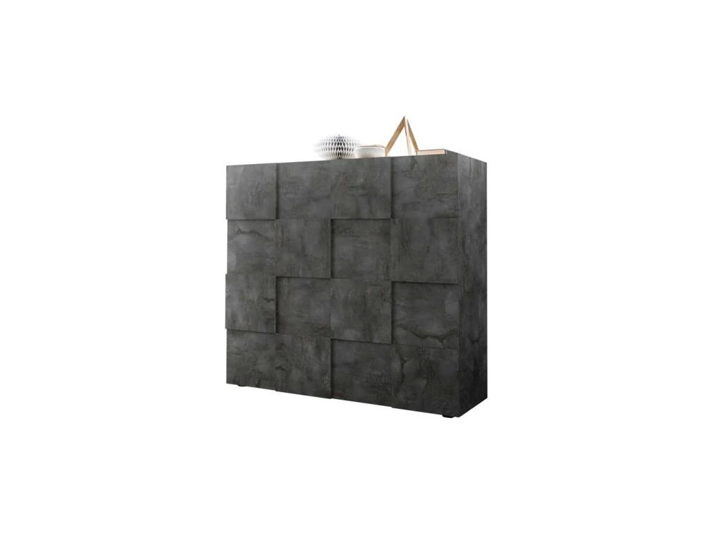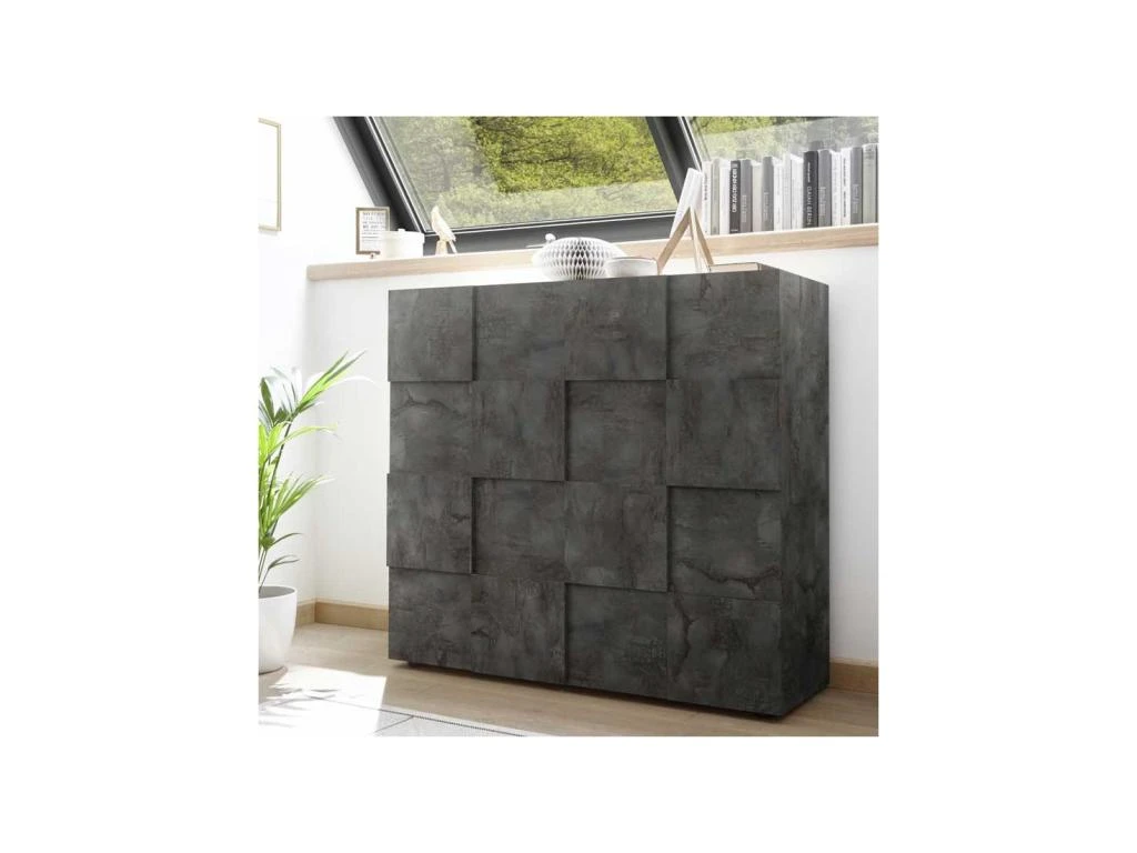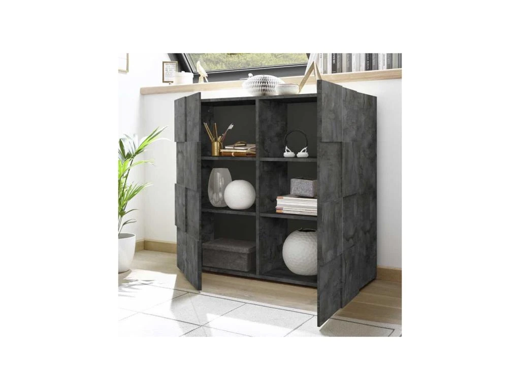 Les façades des ouvrants de ce meuble audio/visuel sont pourvues d’un damier en relief magnifié par la finition béton ciré foncé, bluffante de réalisme.