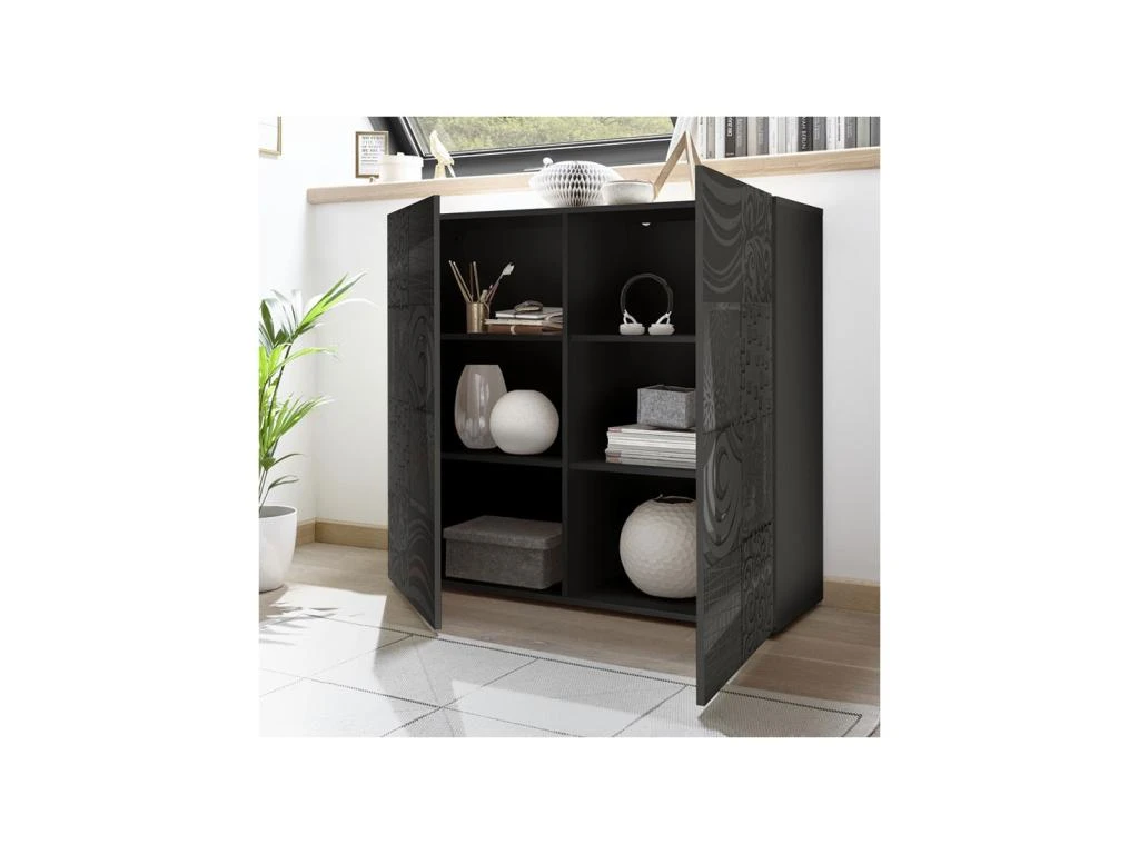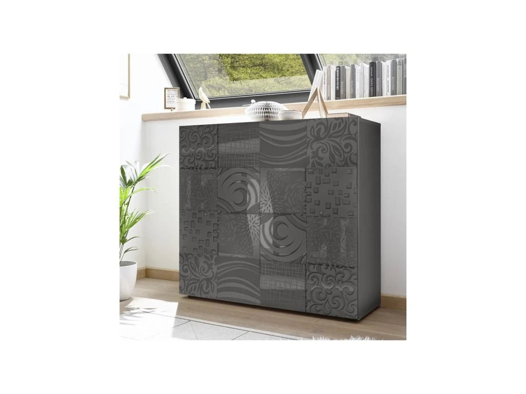 Cette armoire de salon contemporaine au format original met en avant une façade sérigraphiée de motifs variés qui sont mis en relief par la véritable laque Gris haute brillance.