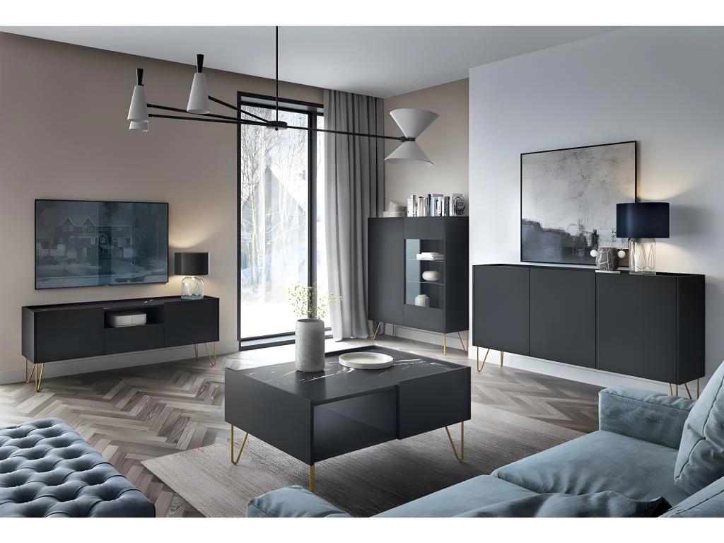 Couleur : Noir mat – Plateau façon marbre Marmur Roya Noir – Pieds couleur or