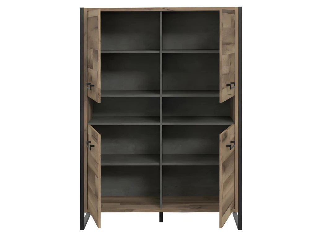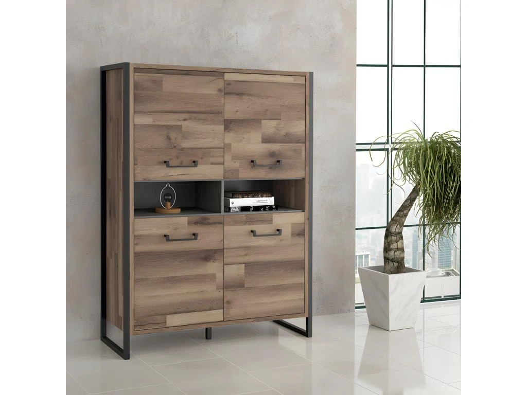 Apportez à votre salle à manger une touche industrielle et rustique avec le vaisselier APACHE. Ses 4 portes et 8 compartiments vous apporteront un bel espace de rangement pour votre vaisselle ou vos documents. Vous pourrez mettre en valeur de petits objets de décoration dans ses 2 niches apparentes. Son décor bois recyclé se caractérise par un motif de planches aux différentes teintes pour un effet rustique et ancien. On aime ses pieds en métal noir qui structurent l’ensemble du meuble et lui apportent une touche de légèreté tout en accentuant le côté industriel. Ses fines poignées en métal noir ajoutent de la finesse au vaisselier.