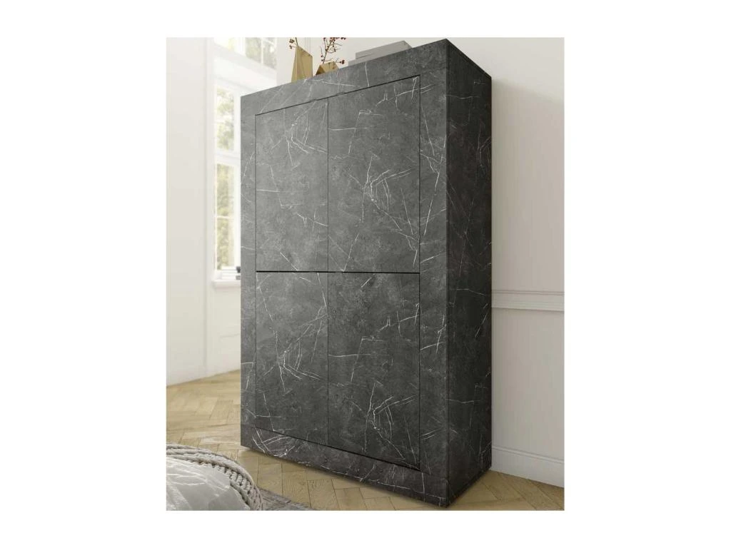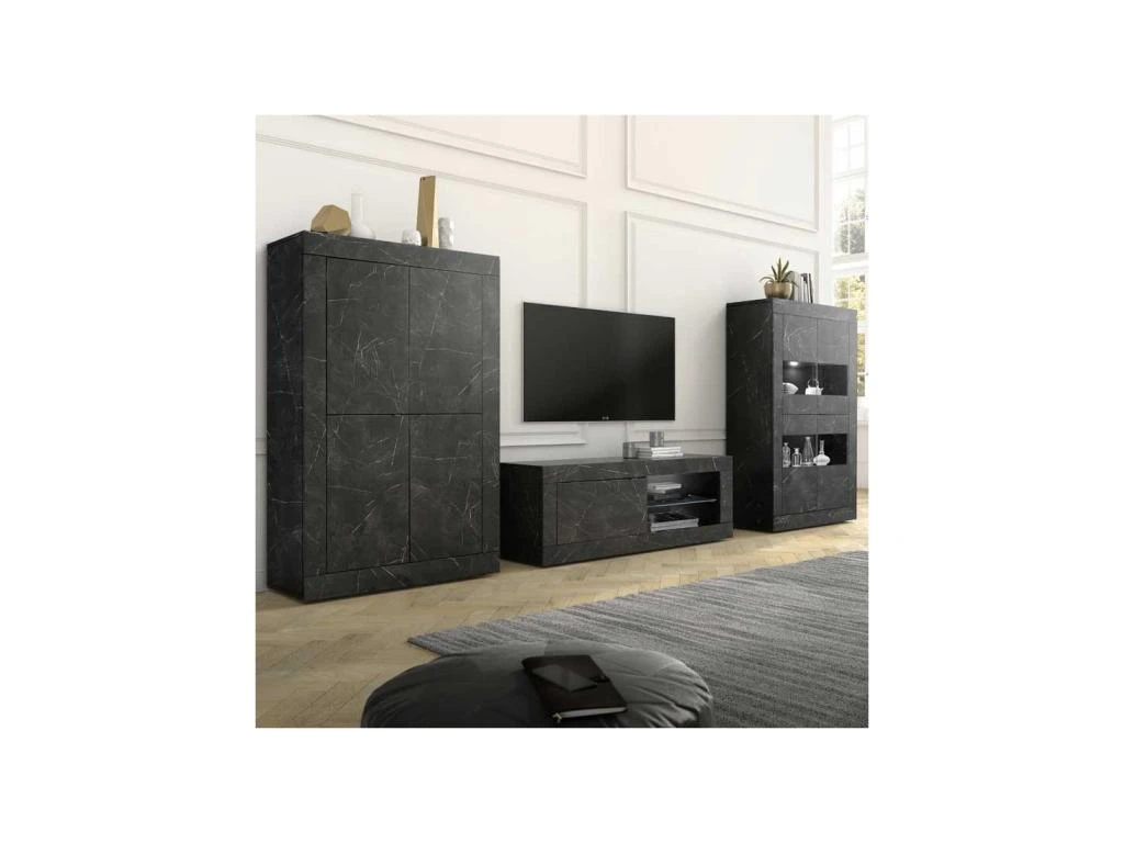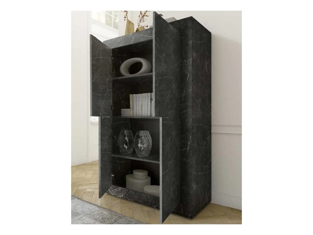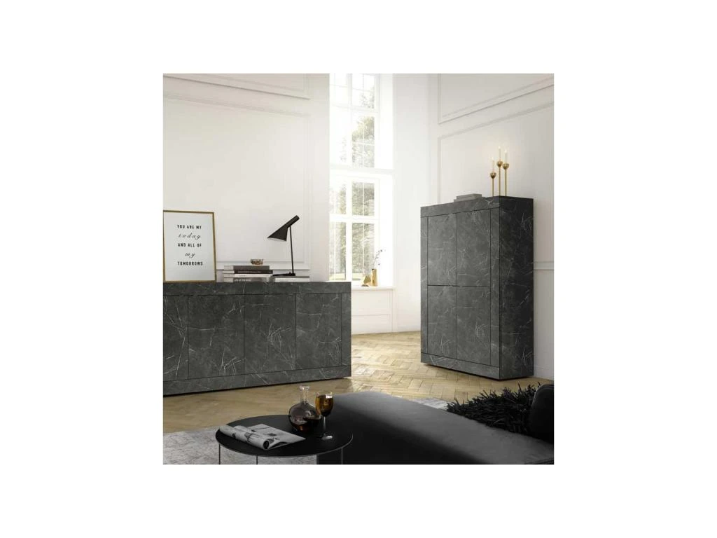Spectaculaire vaisselier 4 portes revêtu d’une finition Marbre noir au rendu très probant idéal pour mettre en scène une déco de salle à manger exclusive.