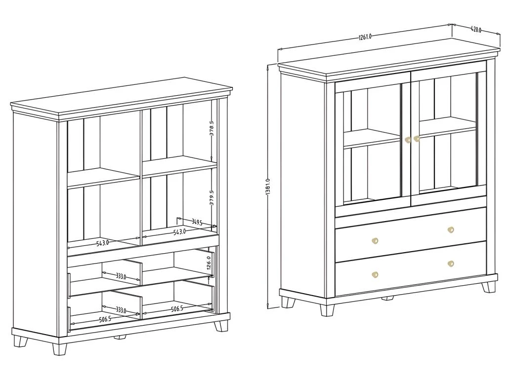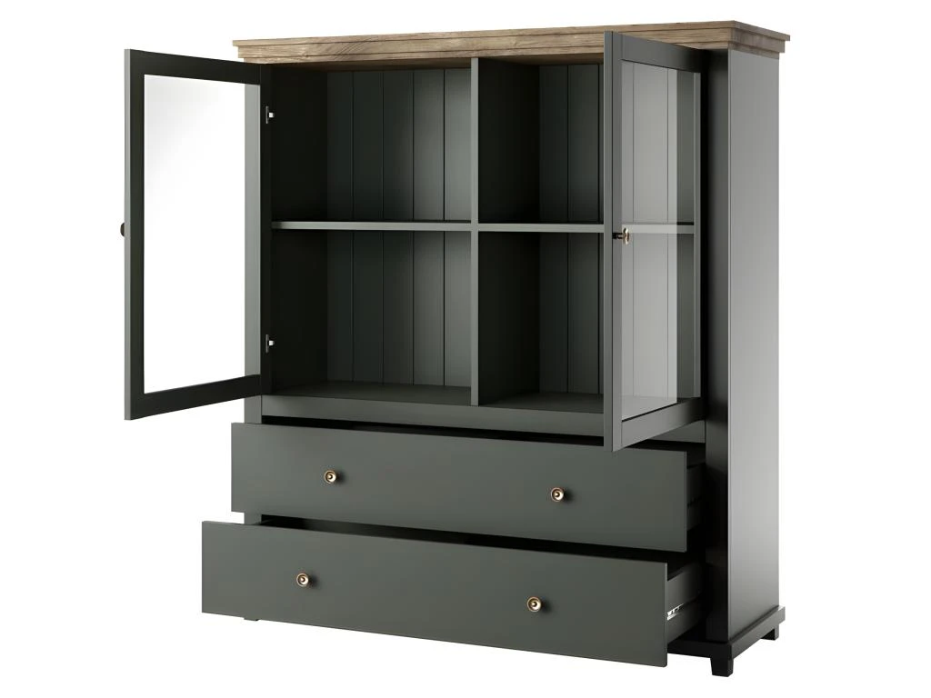 – CARACTÉRISTIQUES : Vaisselier avec 2 portes battantes, 2 tiroirs et de nombreuses étagères. Grand espace de rangement grâce à ses nombreuses niches.