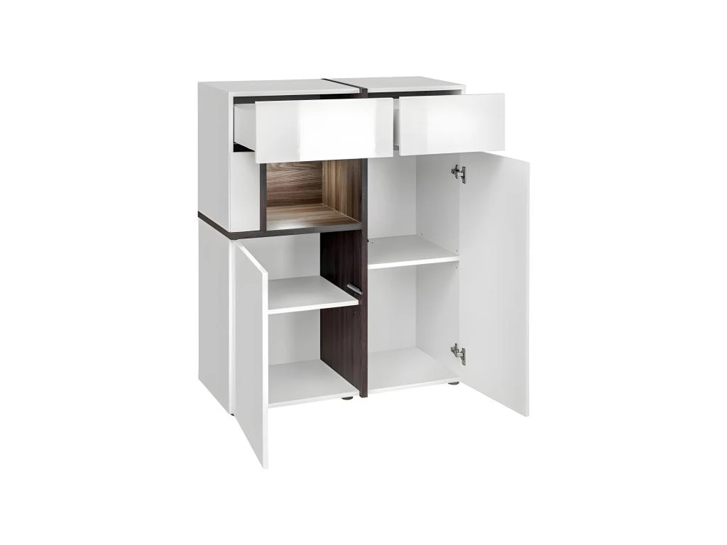 – CARACTÉRISTIQUES : 2 portes pleines, avec étagères, une niche avec un système LED et deux tiroirs. Présence également du système « push to open » intégré aux portes.