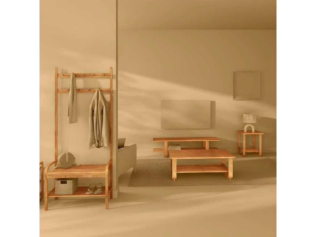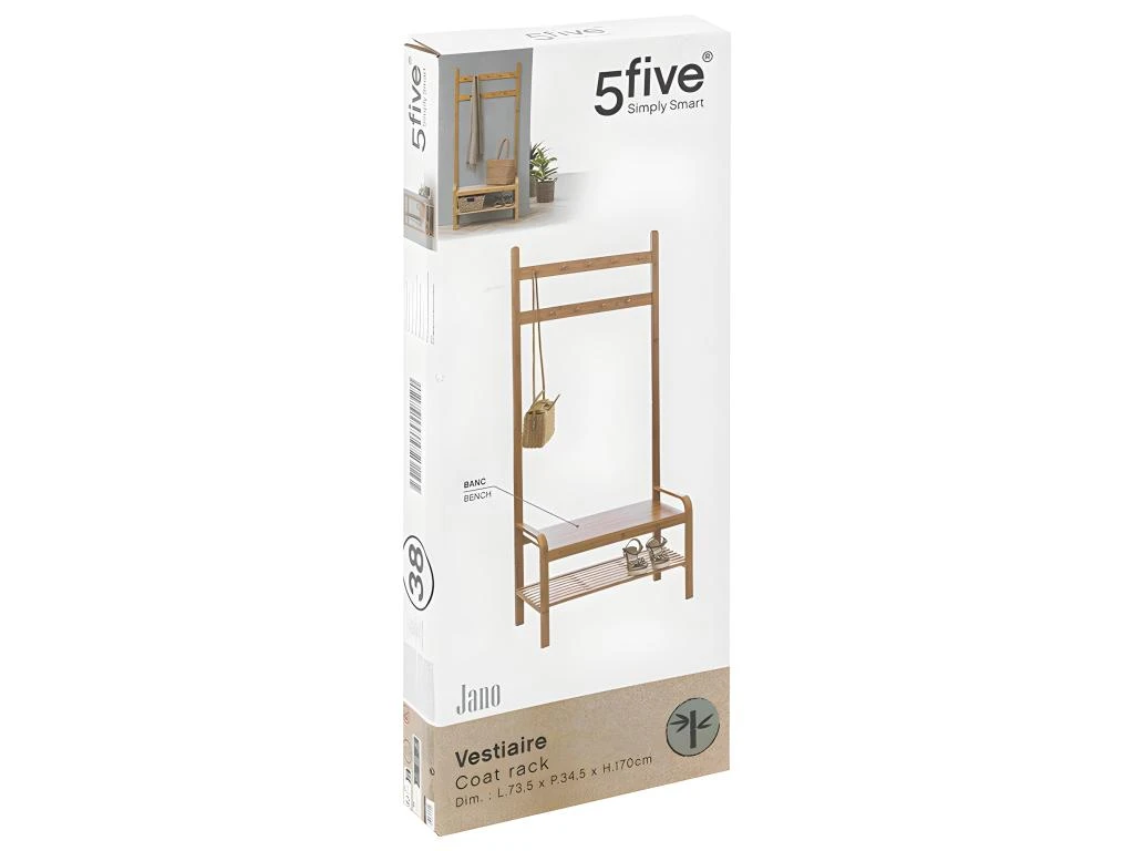 Découvrez le vestiaire d’entrée en bambou de la marque 5five. Pratique, ce vestiaire dispose de : deux rangées de patères, une partie banc et un niveau range chaussures. Se place idéalement dans une entrée mais convient très bien dans une salle de bain car le bambou lui confère une haute résistance à l’humidité. A monter soi même. Dimensions : L. 73,5 x l. 34,5 x H. 170 cm. Poids : 6,347 kg. Matière : bambou. Marque : 5five.