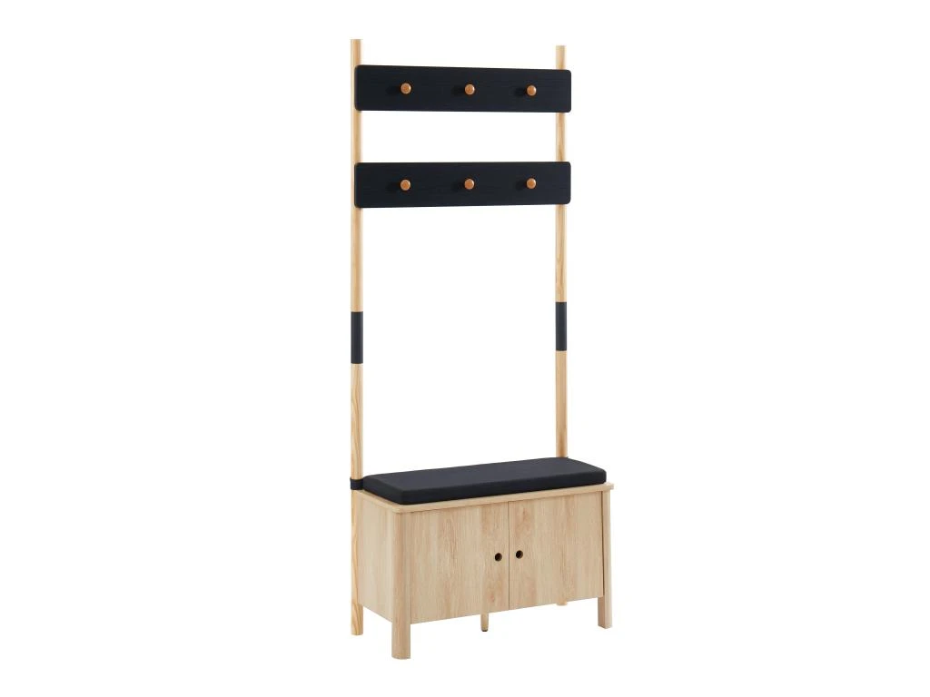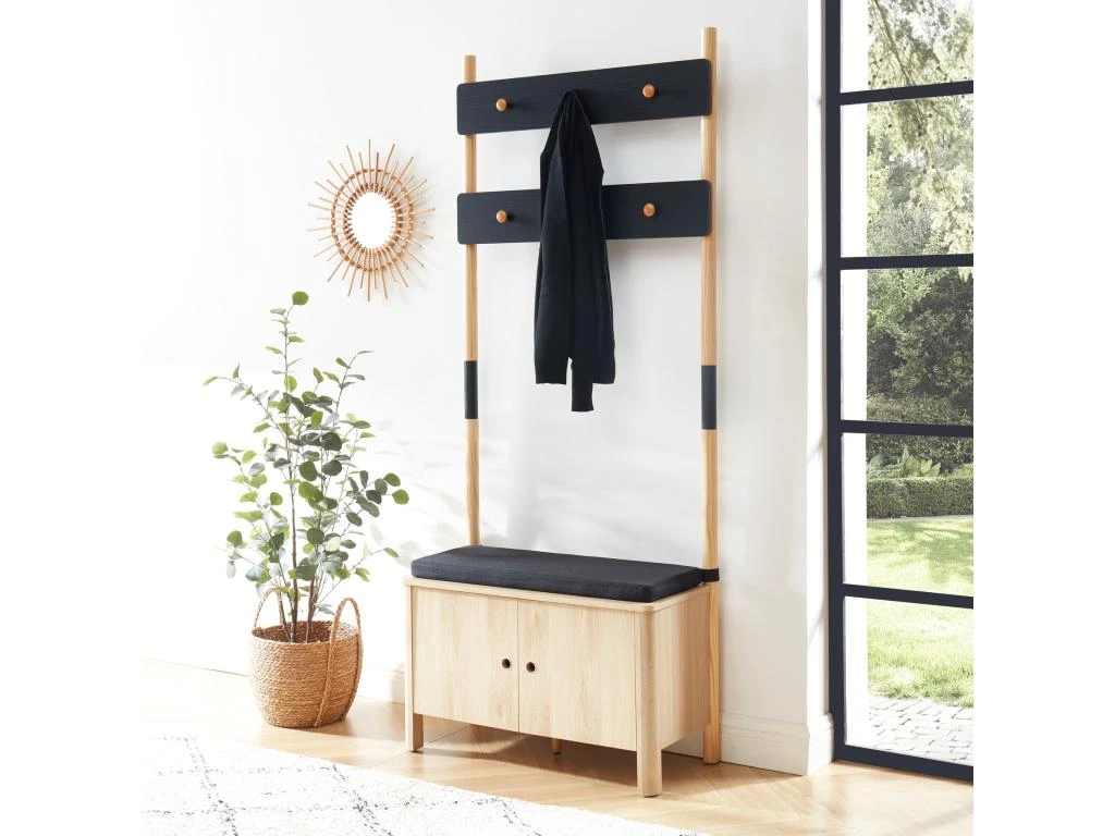 Ce vestiaire est un 3 en 1 ! Il se compose d’un rangement chaussures à 2 portes pouvant contenir jusqu’à 4 paires de chaussures. Profitez du joli banc avec son assise moelleuse en tissu gris pour vous chausser facilement. Le vestiaire JAPENDI est également doté de 6 crochets pour accrocher vos vestes et manteaux.