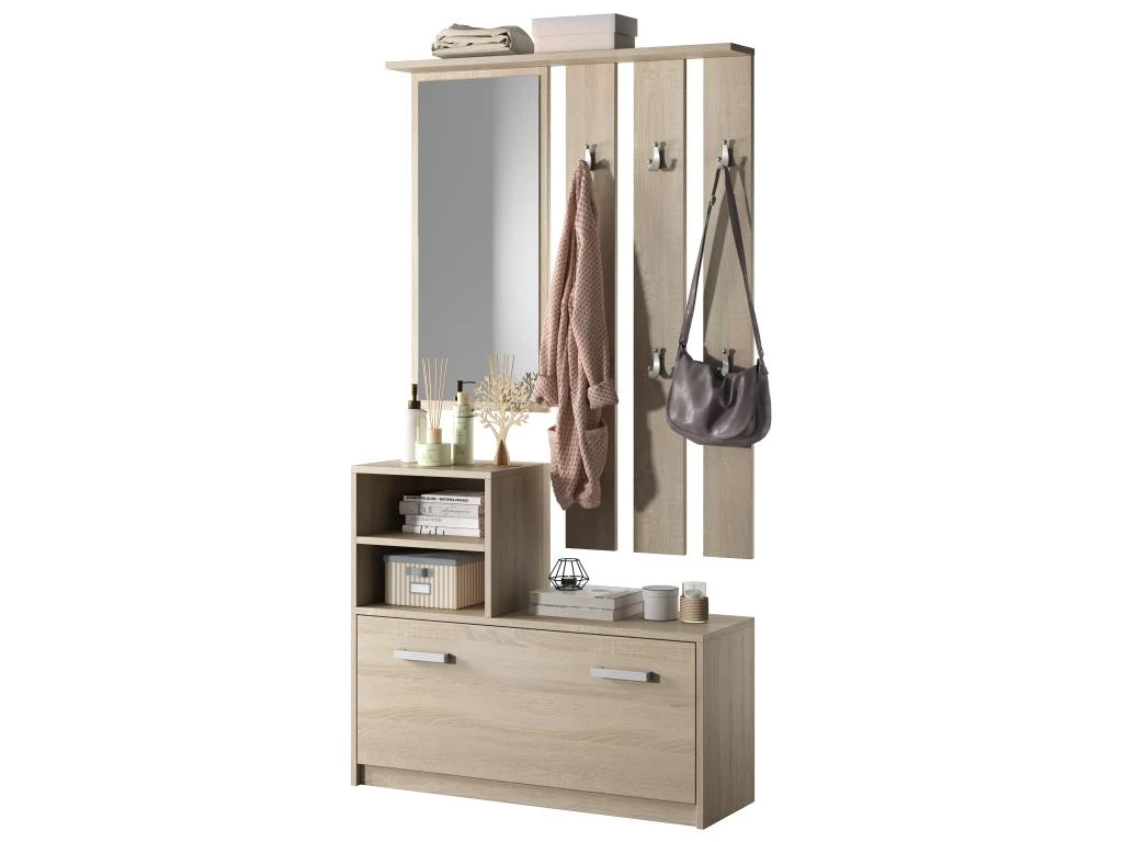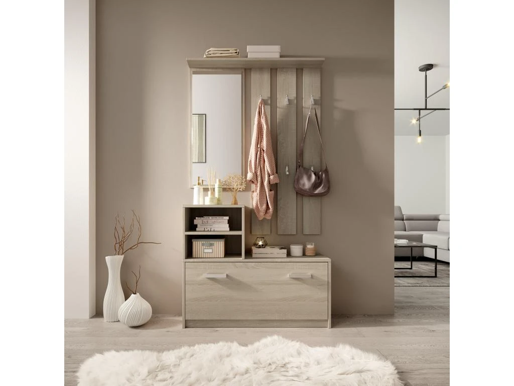 – armoire à chaussures, 2 niches ouvertes, portemanteau mural avec 6 crochets, miroir, étagère à chapeaux