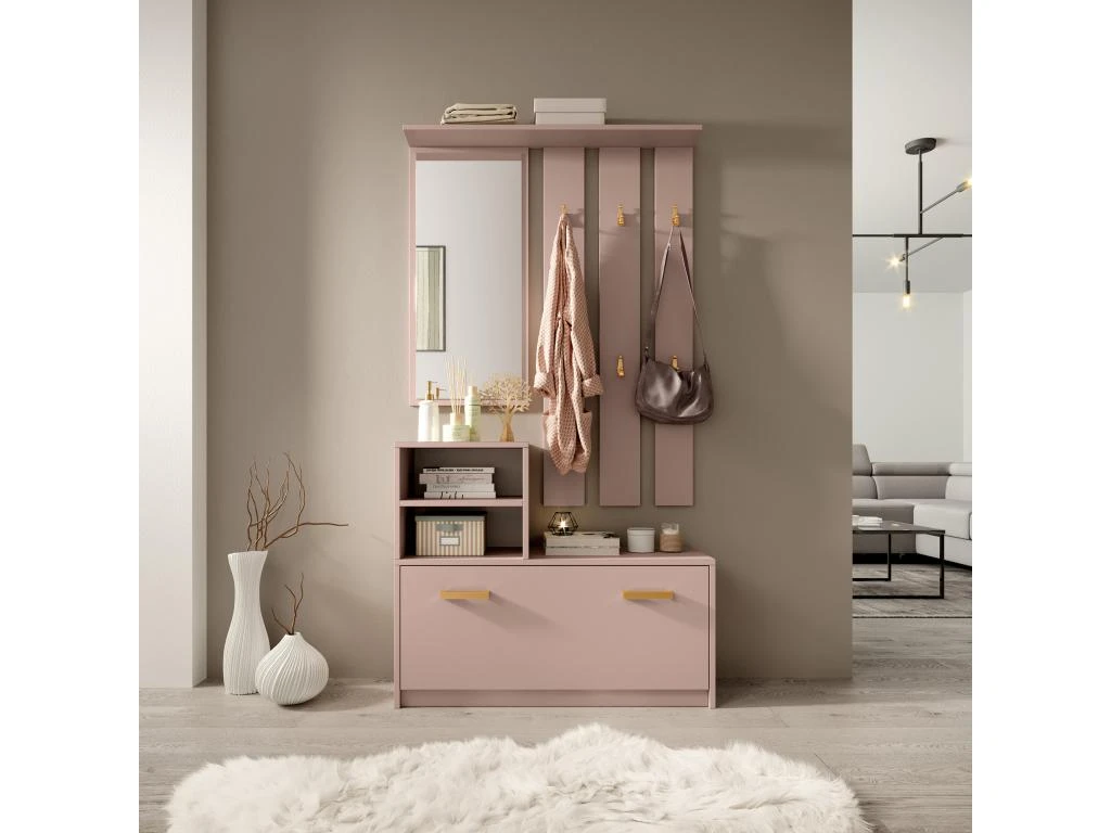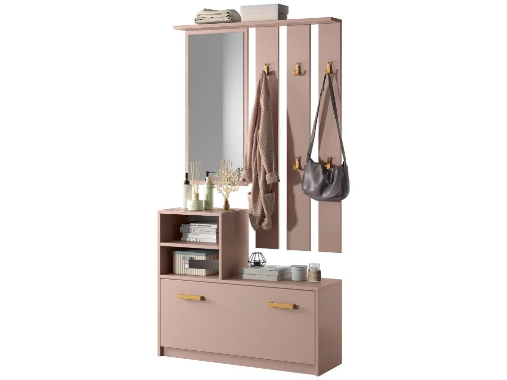 – armoire à chaussures, 2 niches ouvertes, portemanteau mural avec 6 crochets, miroir, étagère à chapeaux