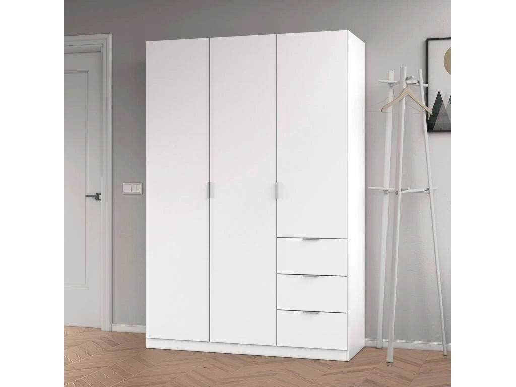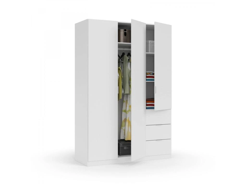 STRUCTURE ET UTILISATION – Armoire complète avec trois portes battantes, trois tiroirs, trois étagères fixes à l’intérieur (dont deux étagères réglables en hauteur dans la porte droite), grâce à l’organisation interne de ses espaces, elle offre un grand espace de rangement – L’ensemble la structure du meuble est parfaite pour meubler une chambre double, une chambre d’enfants ou une chambre d’amis de manière peu encombrante – Les étagères internes combinées à la tringle à vêtements vous permettront de ranger les vêtements et les robes de manière ordonnée.