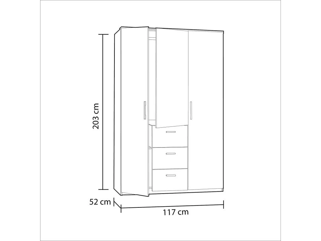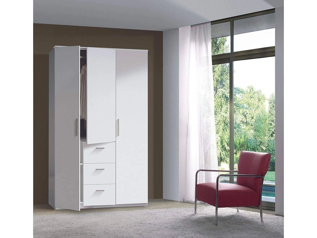 STRUCTURE ET UTILISATION – Armoire complète avec trois portes battantes et trois tiroirs, à l’intérieur une tringle à vêtements et quatre étagères fixes, grâce à l’organisation interne de ses espaces, elle offre un grand espace de rangement – Toute la structure du meuble est parfaite pour l’ameublement de manière peu encombrante une chambre principale, une chambre d’enfant ou la chambre d’amis – La tringle à vêtements vous permet de ranger soigneusement vos vêtements et vos vêtements.
