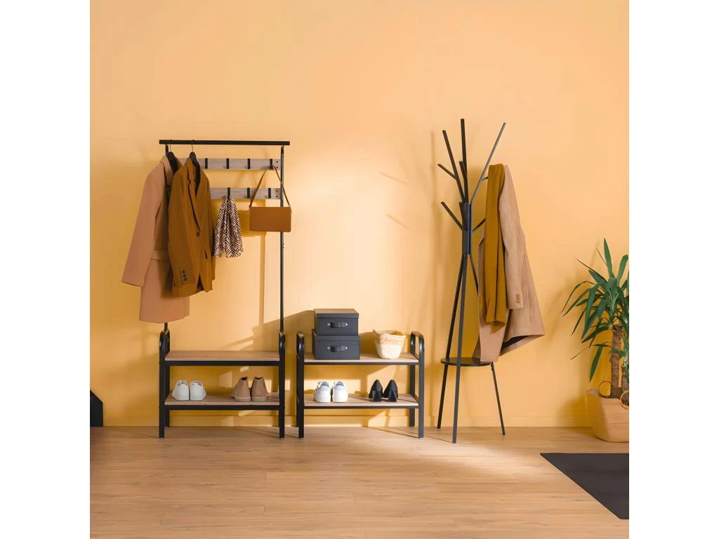 Vestiaire d’entrée Jano de marque 5five.La collection Jano propose plusieurs meubles pour le rangement des vêtements et chaussures, en bois et métal, dans un style résolument moderne. Vestiaire composé d’une partie inférieure pour le rangement des chaussures, une partie intermédiaire avec des patères pour les manteaux et une partie supérieure avec barre pour y accrocher des cintres. A monter soi-même. Dimensions : L. 73,5 x l. 34 x H. 170 cm. Poids : 9,672 kg. Matière : Fibres de bois (MDF) et métal. Marque 5five.