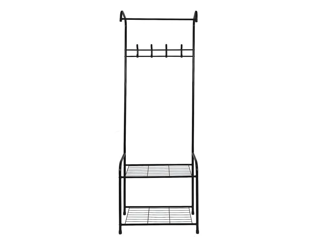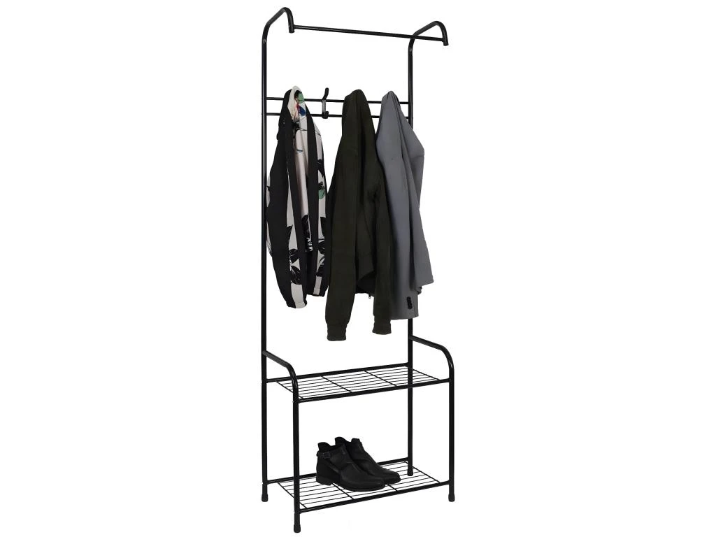 Structure en Inox et Plastique. Dispose de 2 étagères de rangements, 4 crochets, et 1 barre de penderie.